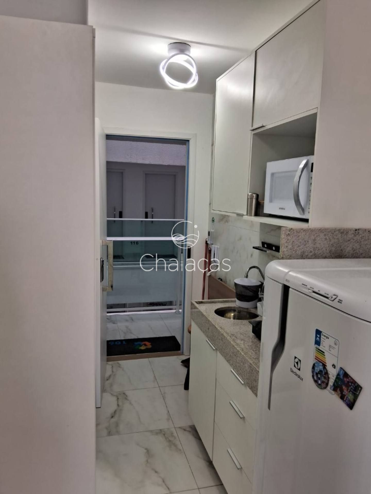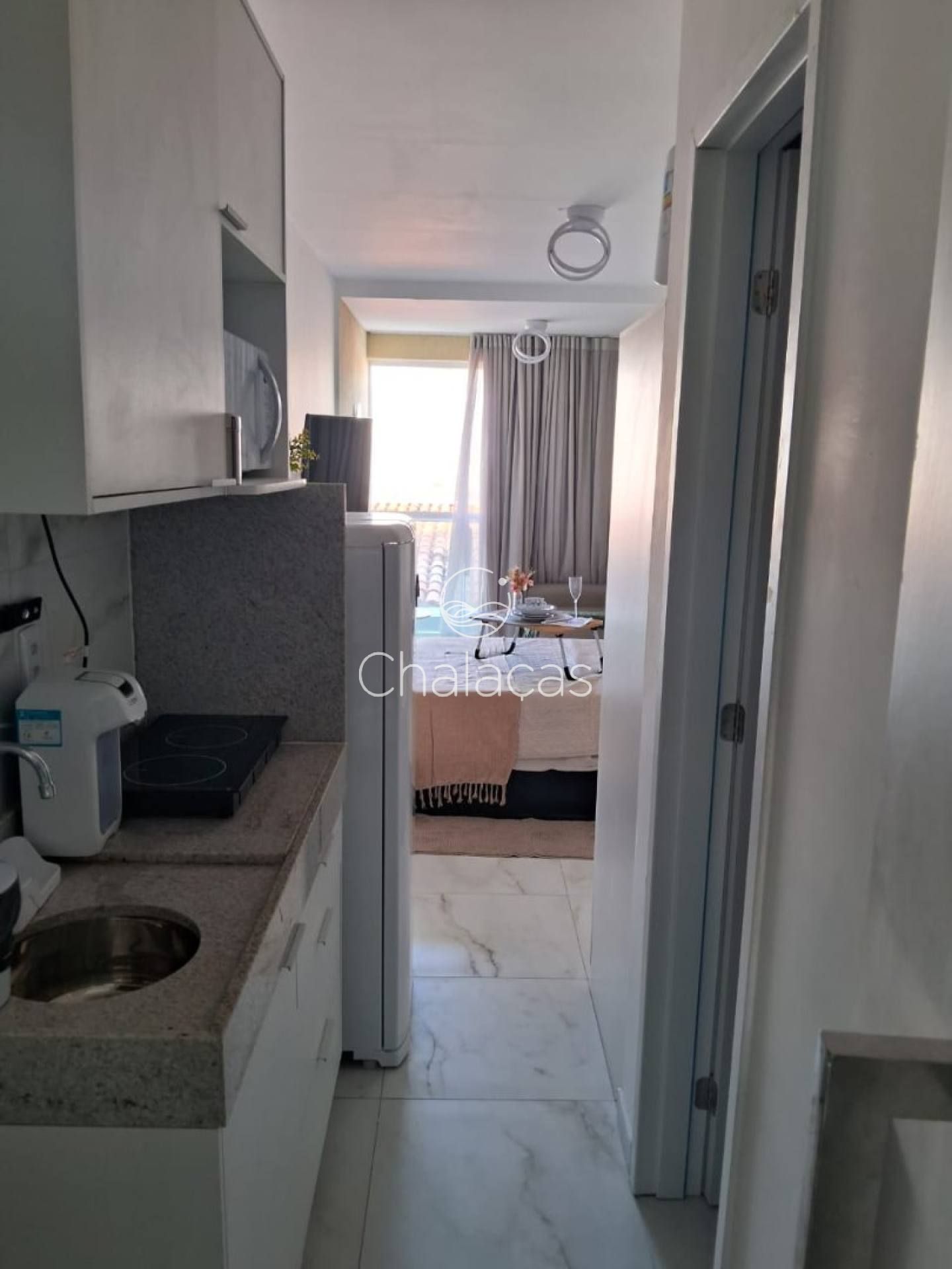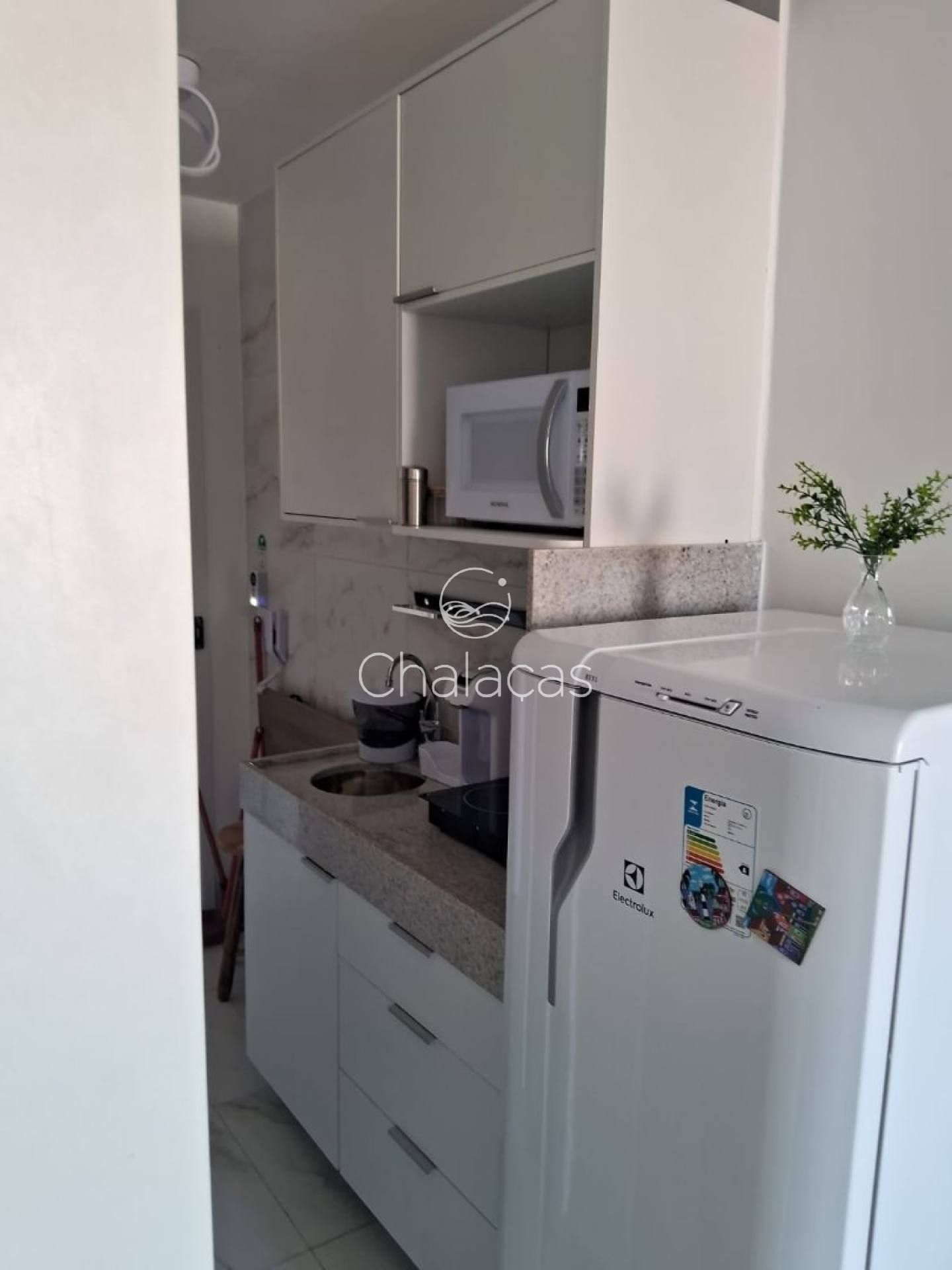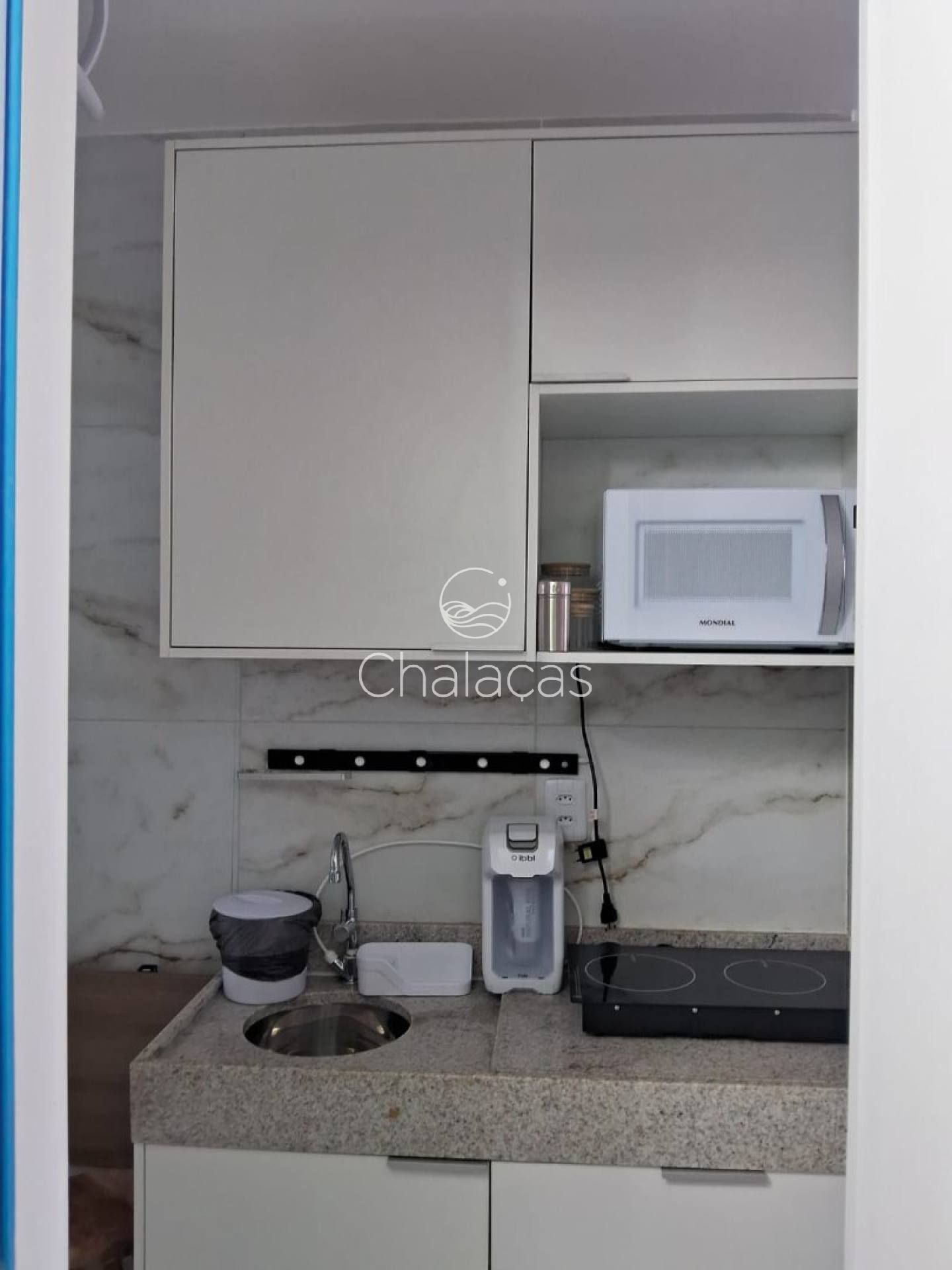 Cozinha funcional: Equipada com cooktop de indução, micro-ondas, frigobar, purificador de água e armários planejados.