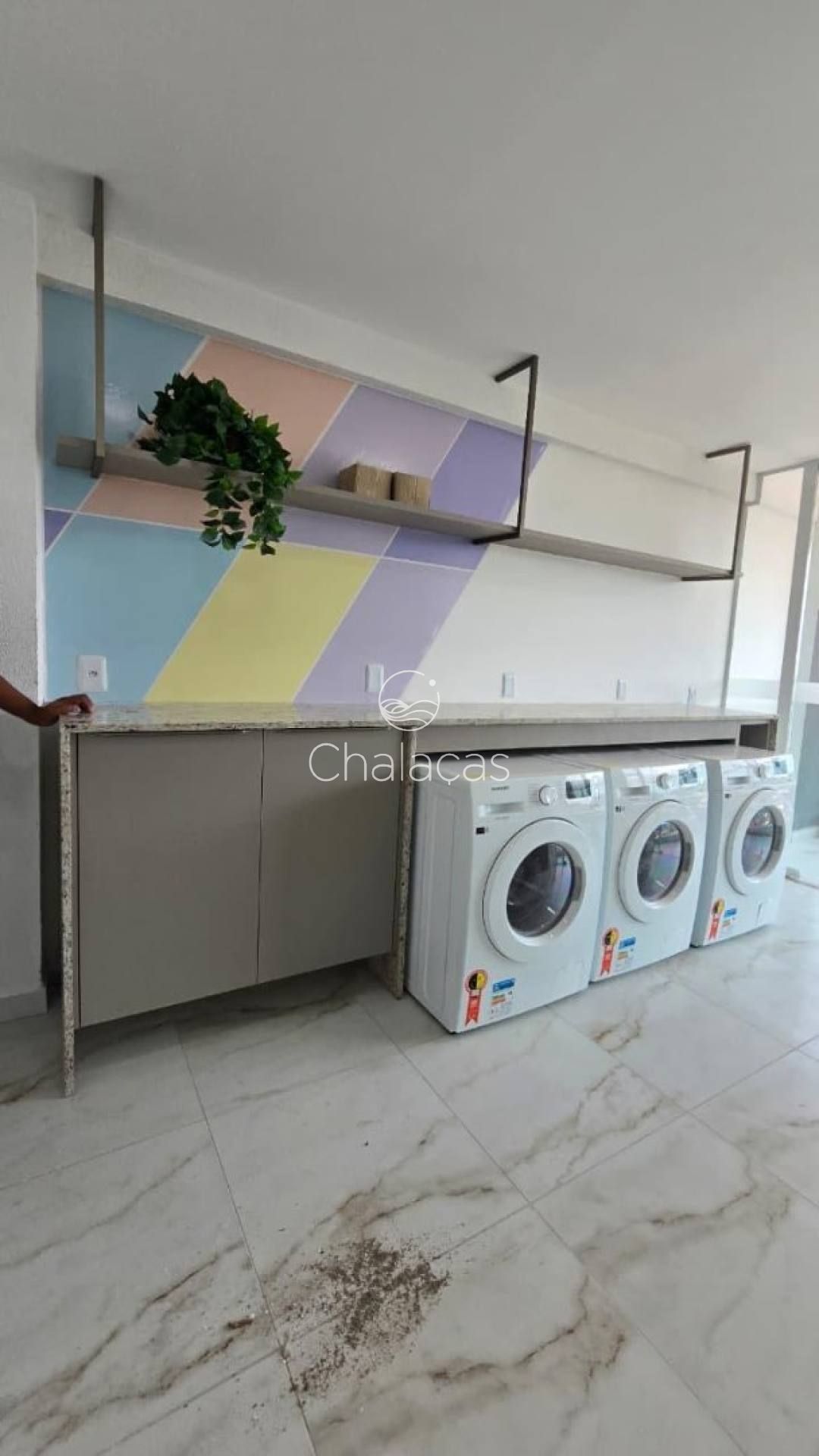 Praticidade: Lavanderia coletiva equipada e recepção com controle de acesso.